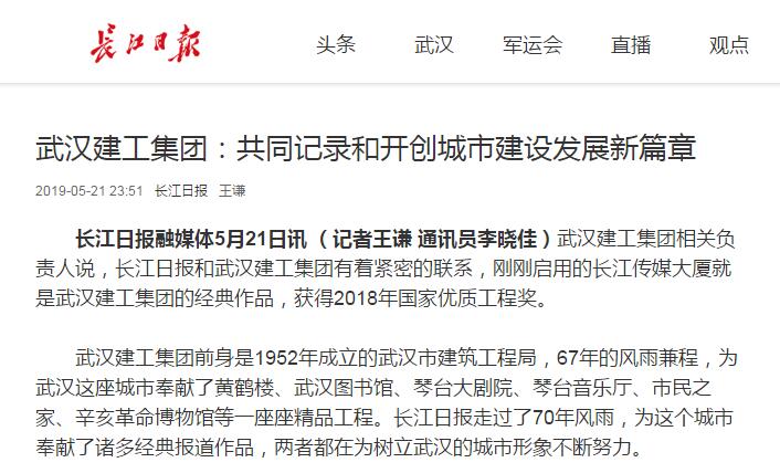 長江日報融媒體5月21日訊 (記者王謙 通訊員李曉佳)武漢建工集團相關(guān)負責(zé)人說,長江日報和武漢建工集團有著緊密的聯(lián)系,剛剛啟用的長江傳媒大廈就是武漢建工集團的經(jīng)典作品,獲得2018年國家優(yōu)質(zhì)工程獎。