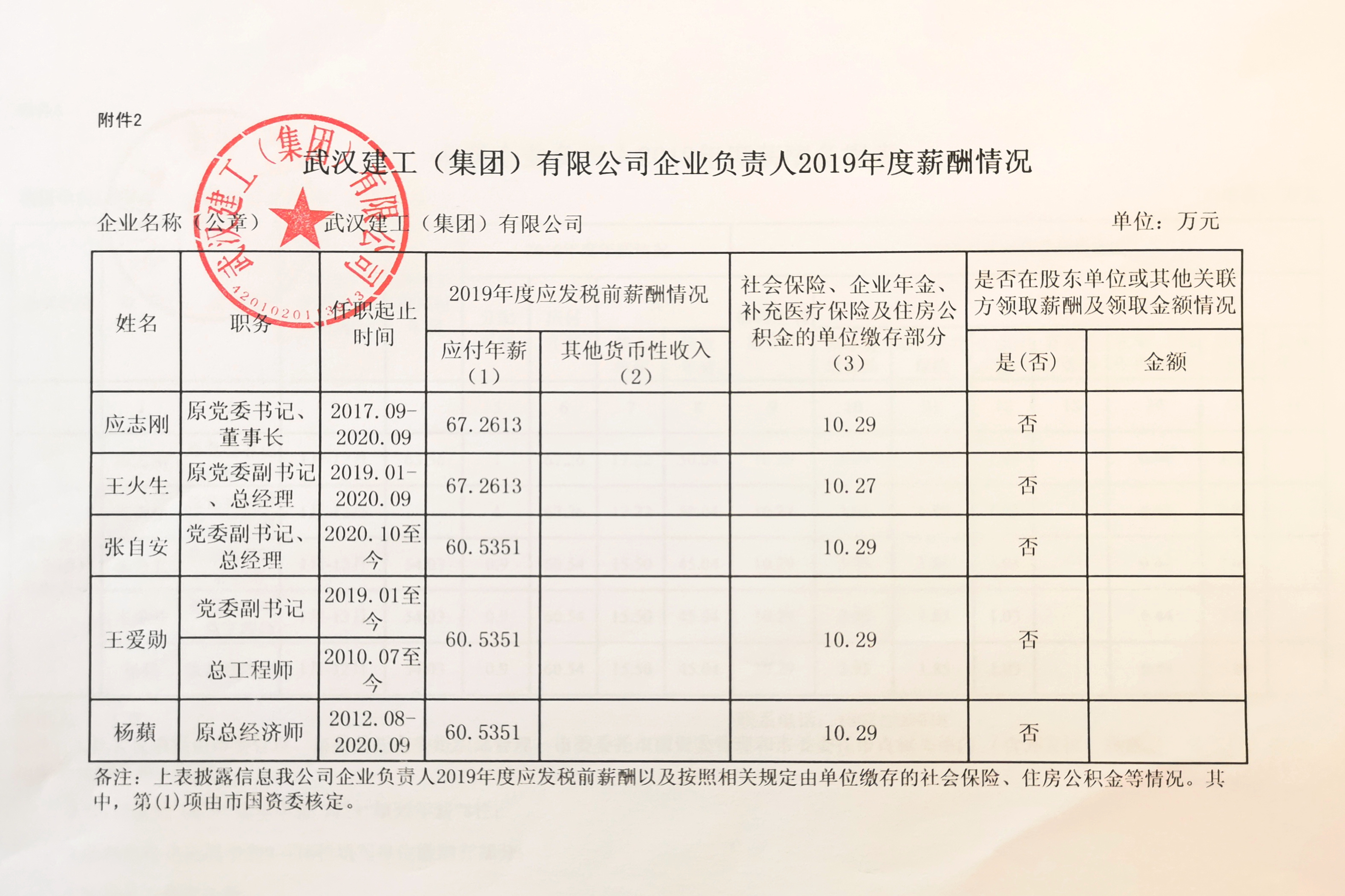 武漢建工(集團(tuán))有限公司企業(yè)負(fù)責(zé)人2019年度薪酬情況